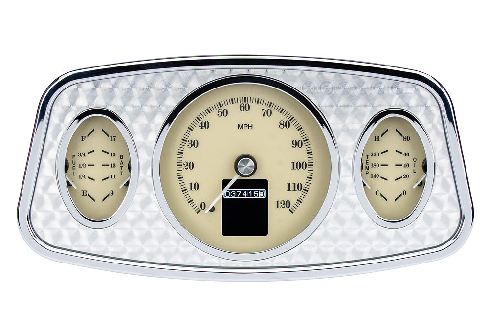 RTX-33F-X Walking the line between jewelry and car part, the RTX-33F is a sight to behold. From the brushed instrument faces to the chrome bezel with engine-turned aluminum insert, our engineering team really got a work out with this one. Engine RPM is displayed by an LED bar graph that wraps around the outside of the speedometer, and the full-color TFT message center allows additional information to be displayed above and beyond the standard six. The billet aluminum housing matches the stamped raised section in a 1933-34 Ford car dash; cutting is required.